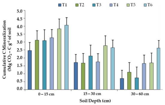 Almost all treatments depict a higher rate of Cmin at 0–15 cm soil depth than at sub-surface layers (15–30 cm and 30–60 cm). The cumulative values of CO2-C evolved over the incubation period of 1 year showed a progressive trend among the treatments receiving different combinations of organic manures and biofertilizers (Figure 5). Averaged over all the soil depths studied, the treatment with GM + FYM + BF (T6) showed the greatest cumulative Cmin throughout the incubation period, and it was lowest in the control (T1). The Cmin at 0–15 cm depth ranged from 4.06 to 2.46 mg g−1 soil, and T6 and T5 (GM + FYM) recorded 65% and 56% higher Cmin over T1. Similarly, at 15–30 cm soil depth, T6 and T5 increased Cmin by 55% and 62%, and at 30–60 cm depth, the increases were 274% and 141% over the control, respectively.