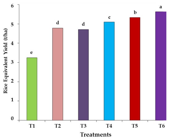 The REY ranged from 3.25 to 5.63 t ha−1, and the highest yield was recorded for T6 where GM, FYM and BF were applied together. However, compared to the control, a 47 to 73% increase in REY was recorded with the organic treatment (Figure 6).