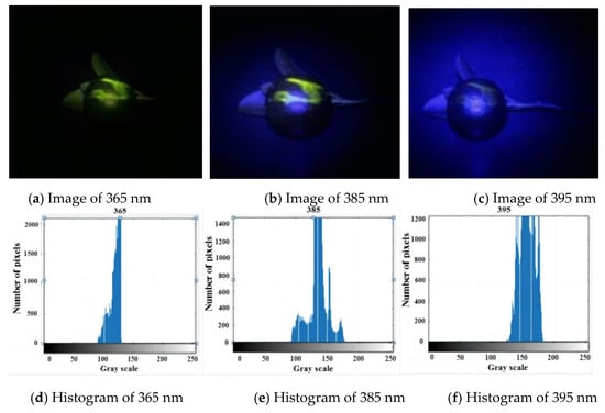 Ketone fluorescence requires UV excitation at certain wavelengths [] used a fluorescence spectrophotometer to conduct a test on the citrus epidermis and found that emission brightness was the highest when the excitation wavelength was around 380 nm. Experiments were carried out with UV light sources of common specifications, and the fluorescence of the defective parts of citrus mitis under the excitation wavelength of 365, 385, and 395 nm was compared. Analyzing the color images, as shown in Figure 1a–c, revealed that the fluorescence at 365 and 385 nm was relatively obvious, while at 395 nm, it was not obvious because, at that wavelength, a fluorescent lamp looks white. When testing the defects of immature citrus mitis (indigo), the green fluorescence of the defective part was similar to that of the normal indigo skin of immature citrus mitis, which hampered defect identification. Under light at 385 nm, the skin of the immature citrus mitis was dark violet, which contrasted sharply with green fluorescence. The histogram of the citrus image in component a was analyzed, as shown in Figure 1d. There are two peaks at 365 nm: the one on the left is the defective part, and the peak and valley between it and the citrus and background parts were not obvious, so it was difficult to see the defect. As shown in Figure 1e, the histogram at 385 nm had three peaks where the peak and valley between the defective part on the far left and the other peaks were obvious, so the defect was easily separated. As shown in Figure 1f, the histogram at 395 nm had only one peak, which indicated that the defect was not obvious and could not be separated. On the other hand, the UV light at 385 nm was less expensive than other specifications. Therefore, this vision system adopted the Juhong chip UV-LED.