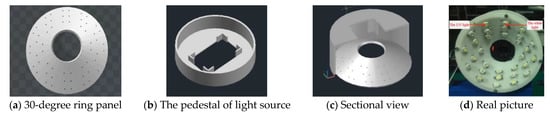 Based on the preceding, a self-made multilight-source structure lamp was designed and adopted in this vision system that included white LED and UV lamps at a wavelength of 385 nm and with the structure of a 30° inclined ring panel. Referring to the principle of a shadowless lamp with multi-angle irradiation, combined with the circular shape of citrus mitis, the system light source was designed to be an inclined ring lamp to achieve uniform illumination on the surface of citrus mitis and eliminate the shadow. To increase fluorescence excitation energy, the system light source should be concentrated by tilting it to a certain angle. Comparing the fluorescence of the defective part of citrus mitis under the irradiation of a planar circular and an inclined ring light source with an angle of 30°, the inclined ring light source concentrated UV light on the surface of citrus mitis, which enhanced the fluorescence of the defective part. Because the white and violet LEDs were arranged alternately, they were concentrated and evenly distributed on the surface of the citrus. The structure is shown in Figure 3.