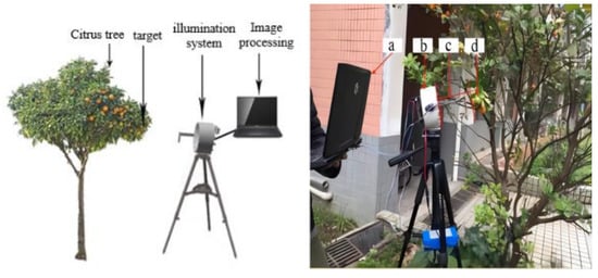 Image acquiring scene. a. PC for visual processing, b. Light vision system, c. Shooting distance, d. The target of citrus.