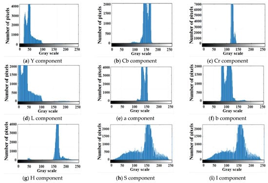 Figure 6 shows the histogram of each component of a 512 × 288 citrus UV image in the YCbCr, Lab, and HSI color models. This citrus UV image had a fluorescence defect, but it occupied the smallest area, whereas the background occupied the largest; therefore, the histogram with a peak ordinate of less than 500 was the defective part, 500–9000 was the citrus portion, and >9000 was the background. To highlight the histogram of the defective part, the ordinate range of the partial histogram in Figure 6 was adjusted. As shown in Figure 6b, in the YCbCr color model, the grayscale of citrus defects in the histogram of the Cb component was distributed in the range of 60–120, while the grayscale of citrus and background was in the range of 120–180. In Figure 6c, the grayscale of citrus in the Cr component histogram was distributed within the range of 110–130, while the background part was within the range of 130–153. Therefore, the Cb and Cr components can separate citrus, defect, and background well, but classification may still be misjudged due to the close proximity of the gray scale regions of the three parts. As shown for the Lab color model in Figure 6d–f, the grayscale level of the defective part in the three components was in the front or back end of the histogram distribution, so the defective part was more prominent in this model. For the H component of the HSI color model in Figure 6g, there was a large interval between the defective part and the background and citrus parts, so the Lab model and the H component separated the defective part better.