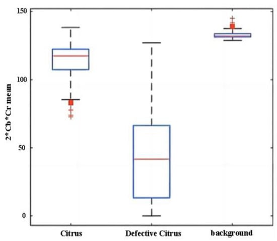 Boxplot of 2*Cb-Cr feature mean. The three red lines of the three blue boxes in the figure are the median of the feature of citrus, defective citrus and background respectively. The two lines above and below the blue box represent the maximum and minimum values of the feature.