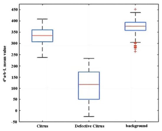 Boxplot of 4*a−b−L feature mean. The three red lines of the three blue boxes in the figure are the median of the feature of citrus, defective citrus and background respectively. The two lines above and below the blue box represent the maximum and minimum values of the feature.