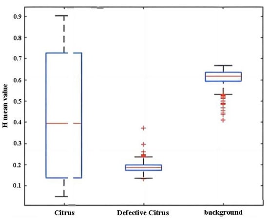 Boxplot of H feature mean. The three red lines of the three blue boxes in the figure are the median of the feature of citrus, defective citrus and background respectively. The two lines above and below the blue box represent the maximum and minimum values of the feature.