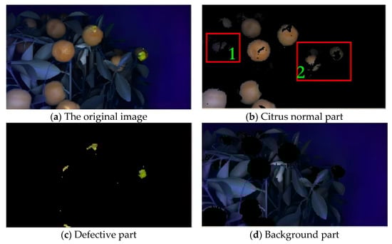 The image acquired by the multilight-source vision system had a resolution of 1920 × 1080 and a size of 1280 × 720. To reduce the computational load of the algorithm and speed up operation, the citrus UV images were compressed into 512 × 288 without affecting the image quality. The compressed image was converted into YCbCr, Lab, and HIS color models, from which the three color features of “2*Cb-Cr”, “4*a-b-l”, and “H” were obtained. For each image pixel, these features constituted a feature matrix where the number of image pixels was the number of rows, and the number of features was the number of columns, which were the input variables of the SVM. The trained model classified each pixel according to the feature matrix, which divided the citrus UV image into three parts: defective, non-defective, and background, and output a label matrix. The classification results of the SVM model are shown in Figure 11. Figure 11a–d represent the original image, the normal-part pixels of the citrus, the defective part pixels of the citrus, and the background part, respectively.