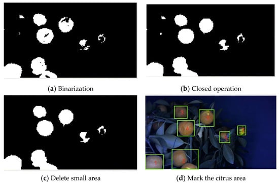 After classification by the SVM model, the normal-part image revealed gaps and holes in the detection of the citrus, as shown in Figure 11b. This may have been caused by leaves or branches covering citrus on trees or by epidermal defects. To obtain a more complete citrus region, the normal-part binary image of citrus after SVM classification was closed to fill in the gaps in the shaded part and the holes in the defective part. The binary image is shown in Figure 12a, and the result of the closed operation is shown in Figure 12b. Afterward, there were still small areas in the normal part of the citrus because the dim part of the citrus was ignored in the OTSU threshold segmentation [] (leaving only a small white area), most of the citrus was blocked, and the exposed area was relatively small. Small areas of citrus can be ignored, so they can be removed by deleting the small area algorithm, as shown in Figure 12c. According to the binary image of the normal part of citrus after processing, the citrus area in the original image was marked by a rectangle to label it, as shown in Figure 12d.