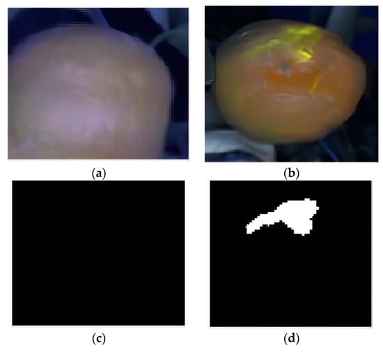 Binary images of citrus areas and defects part. (a) No defect citrus area. (b) Defective citrus area. (c) Binary image of the defective portion of a non-defective citrus region. (d) Binary image of the defective portion of a defective citrus region.