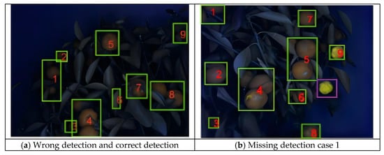 The algorithm in this paper had two problems. First, in the detection of citrus fruits and defects, citrus that were far away from the light vision system and had low brightness and defects that were not obvious and had small areas may be missed. Second, when the target was blocked by leaves, the algorithm may not be able to accurately detect citrus and its defects.