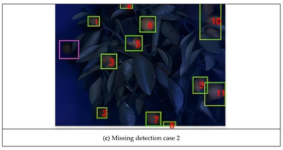 To test the algorithm’s accuracy in citrus region detection, the 39 citrus UV images were identified. Because citrus grows in spring, it is difficult to label them individually. Therefore, the presence of citrus in the marked area was judged to be correct detection, and the number of correct detection rectangles was denoted as correct. When there was no citrus in the marked area, error detection was considered, and an error detection rectangle denoted it. If the citrus in the image with obvious and less shade was not marked, it was considered to have missed detection, and the number of rectangles of missed detection was denoted as misses. Figure 14 shows the detection effect of citrus regions in part of the citrus UV image. In Figure 14a, green rectangle 6 misidentified leaves in the rectangle instead of citrus, which was caused by the misjudgment of the model. With the exception of rectangle 6, the green rectangles correctly identified citrus, as shown in Figure 14a. There were two reasons for missing detection. First, the whole epidermis of the citrus was defective, which led to the failure of the SVM to identify the non-defective part, as shown in the red rectangle in Figure 14b. Second, citrus leakage in the edge of the tree far from the light vision system had a brightness darker than that of the citrus in the center of the visual system; thus, the OSTU threshold segmentation in that region of pixels determined it to be a negative sample, which caused detection to be missed, as shown the red rectangle in Figure 14c. It should be noted that the main task of this study is to detect the normal and defective pixels of citrus. Therefore, the detection result is correct even though there are multiple targets in one prediction box.
