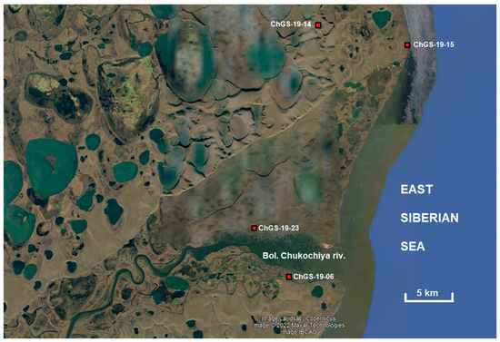 The territory under study mainly represents the valley of the Bol’shaya Chukochya River; it gradually expands towards the sea and reaches more than 10 km in the coastal part with tidal flats and tidal marshes (Figure 2). It is bound by high coasts composed of silty sediments of the ice complex (yedoma) containing relict organic matter and subjected to active degradation [20,21].