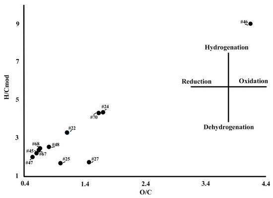To provide a graphical estimation of the hydrogenation/dehydrogenation and oxidation/reduction processes of HAs, a van Krevelen diagram was used (Figure 3).