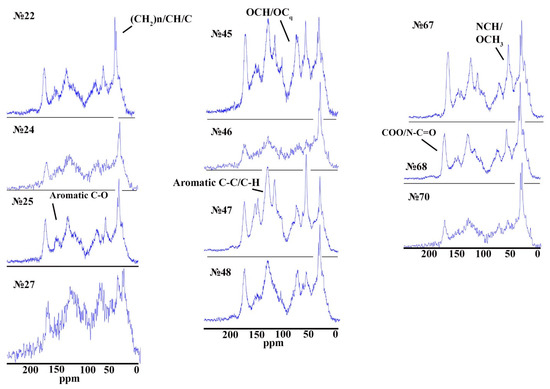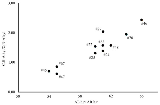 The content of hydrogen, nitrogen and oxygen in soils varies within a wide range; this is due to a rather large number of factors that influence the accumulation of these elements in the structure of HAs (hydromorphism, climate, quality of humification precursors and composition of soil microbiota) [30]. The nitrogen content of the studied HAs varies within a smaller range, with a coefficient of variation of 28%, and the content varies from 1.33 to 4.55% N. In general, the nitrogen content is directly related to plant composition (humification precursors) and the rate of the decomposition of the plant sediment at low rates, mainly accumulated aliphatic HA chains [14,29,34]. The highest nitrogen content was noted in samples #67 and #27. The marsh sample (#67) is a poorly compacted peat, consisting of herbaceous residues. Herbaceous vegetation can accumulate up to 12% of proteins and nitrogen-containing compounds, which can accumulate as part of HAs during their transformation (mineralization and humification). Sample #27 is represented by the underlying permafrost ┴C#˜˜g (suprapermafrost alluvial coarse-humus sediments) with features of gleyization, apparently part of the organic matter during the cryogenic mass transfer that accumulates at the boundary with the permafrost. The change in the hydrogen content of HAs is indirectly related to the quality of humification precursors; moss communities contain more hydrogen than, for example, herbaceous vegetation [13]. The high oxygen content is associated with the better solubility of oxygen-enriched hydrophilic HAs molecules [35].