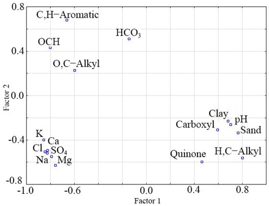 Based on the data obtained, we can observe the relationship between the physical parameters of the soil, the pH and the carboxyl, alkyl and quinone groups. The presented cations and anions are combined in one general group and have no connection with other studied parameters, except for HCO3, which is in the C,H-AR, OCH and O,C-Alkyl groups. The formation of HAs is a very complex process in terms of chemistry, so we cannot claim with complete certainty that the studied physico-chemical parameters are decisive in the formation of HAs.