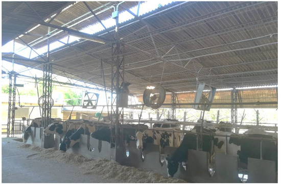 In addition to the fact that the natural ventilation of the indoor space was assured by the open structure, the barn was equipped with sprinklers and fans in the feeding alley and a fogging system with fans in the resting area. The fans located in both the resting area and the feeding alley had tilt angles of 20° from the horizontal plane. In detail, the fans in the resting area had a rotation axis located 2.75 m from the floor along the longitudinal axis of the barn, whereas the fans in the feeding alley had a rotation axis 2.70 m from the floor and parallel to the longitudinal axis of the feeding alley.