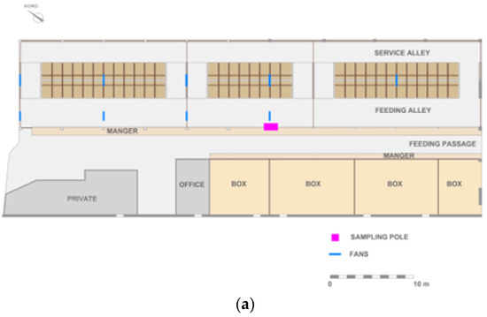 The different functional areas can be distinguished in the plan view of the barn (Figure 2): the feeding area, subdivided into the feeding alley, manger, and feeding passage; the resting area with 64 head-to-head cubicles in two rows and three pens; the service alley for herd management; offices; and boxes for calves, located on the southwest side.