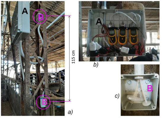 Installation of the low-cost system in the barn (a) with a large box (A) to contain the three low-cost measurement devices and small perforated boxes (B) to contain the sampling points for the measurements. The distance between two different consecutive sampling points was 1.15 m (a). In the large box (b), three low-cost measurement devices were installed. In the small boxes (c), the sampling points for the measurement are shown. In detail, each small box contained the sampling tubes for both the low-cost and reference devices. Each sampling tube was equipped with an air filter.