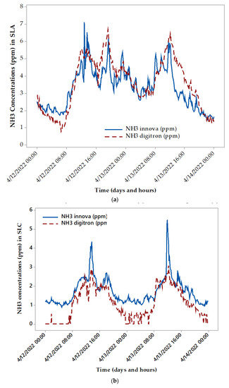 Figure 4 shows the trend of gas concentrations having r > 0.5, acquired at different SLs by using the two measurement devices. A good fit was found between the NH3 concentrations acquired by the reference and the portable device (Figure 4a) with an overestimation of the NH3 concentrations for the portable devices, especially after the peaks of the NH3 concentrations. The graphs show that the NH3 concentrations acquired by the portable devices were lower for SLs located at a greater height from the floor (Figure 4b), thus underestimating the values in comparison to the INNOVA device, whereas the CO2 concentrations acquired by the portable device at 1.55 m from the floor were higher than those of the reference (Figure 4c).