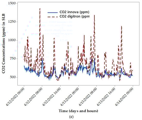 Trends of gas concentrations having r > 0.5 during two days of measurements. In detail, the graphs show NH3 concentrations acquired in SLA (a) and SLC (b) and CO2 concentrations acquired in SLC (c) by using the two measurement devices.