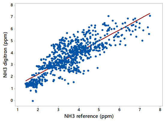 Linear regression analysis between NH3 concentrations (ppm) acquired by the INNOVA analyzer (reference) and NH3 concentrations (ppm) acquired by the low-cost device in SLA.