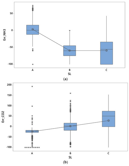 The data on the NH3 and CO2 concentrations acquired by using the low-cost devices and the data acquired by the INNOVA were organized in a spreadsheet based on the time of the day and the location in which the measurement was carried out (i.e., SLA, SLB, and SLC). A specific dataset was implemented by carrying out computations of the relative measurement errors of the low-cost devices, according to the following relation: