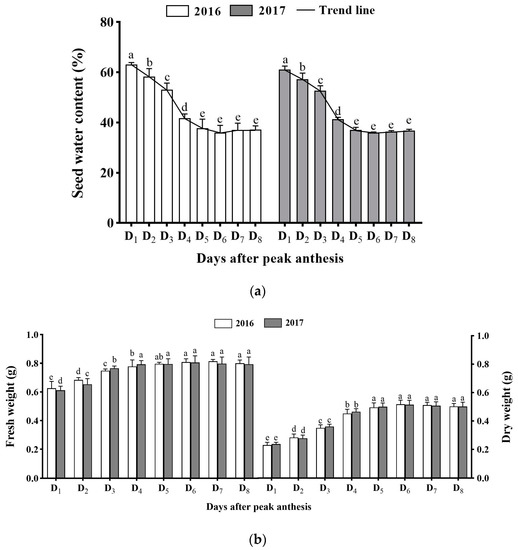 At different harvest times, seeds from the respective plots were harvested separately to form a seedbank. To determine seed fresh weight (FW), dry weight (DW), and water content (WC), 100 seeds were randomly selected from the seedbank. The fresh weights were calculated using a weighing scale with a sensitivity of 1/10,000. The dry weight was obtained by drying fresh seeds at 65 °C to a constant weight, followed by oven drying at 105 °C for 0.5 h. The seed WC of each treatment was estimated for four replications using the FW and DW values of the seeds, and the calculation formula is as follows [22]: