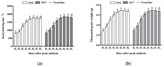It was critical to evaluate seed quality based on the germination percentage (GEP) and germination potential (GP) of seeds. Higher seed quality indicates greater seed vigor and yield potential. In 2016 and 2017, the GEP and GP of seeds harvested before the 24th day after peak anthesis (D4) were less than 80%. This was due to the slightly shorter growth time and a deficiency in dry matter. However, they showed a tendency of rising first and then declining, and their value peaked at D6 (Table 2). During the two-year experiment period, the accelerated aging germination percentage (AAGP) of seeds maintained a progressively growing trend (Table 2). Under normal conditions, seed viability and enzyme activity gradually increased with growing time. The dehydrogenase activity (DA) of seeds significantly increased on the 18th day after peak anthesis (D2), reaching a maximum of 16.23 µg·mL−1 and 16.52 µg·mL−1 at D6 of 2016 and 2017, respectively (Table 2). The variation pattern of the acid phosphoesterase activity (APA) was similar to that of GEP and GP, reaching a maximum at D6 in the two trial years (Table 2). Furthermore, the APA of seeds at each harvest time increased significantly in 2017 compared with the previous year. It is worth mentioning that the four seed quality indices (GEP, GP, DA, and APA) for seeds harvested on the 33rd day after the peak anthesis (D7) period begin to decline at varying degrees. However, their values were higher than those of D1. Therefore, the optimal harvest time was the 30th to 33rd day following peak anthesis to guarantee that seed yield and quality indices were generally at their highest.