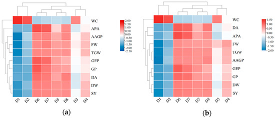 Heatmaps showing a log2-fold change in seed yield and quality observed in K. melanthera based on different days after peak anthesis during the trial years 2016 (a) and 2017 (b). Up-regulated and down-regulated indices are indicated by red and blue, respectively. Note: WC, water content; FW, fresh weight; DW, dry weight; SY, seed yield; TGW, thousand-grain weight; GEP, germination percentage; GP, germination potential; AAGP, accelerated aging germination percentage; DA, dehydrogenase activity; APA, acid phosphoesterase activity; D1—15th day after peak anthesis (control), D2—18th day after peak anthesis, D3—21st day after peak anthesis, D4—24th day after peak anthesis, D5—27th day after peak anthesis, D6—30th day after peak anthesis, D7—33rd day after peak anthesis, D8—36th day after peak anthesis.