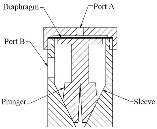 Another novel variable flow rate means was achieved by changing the nozzle orifice’s size and shape (Figure 5). This technology emerged within the past two decades. Firstly, Bui [] and Womac [] tested a variable-orifice nozzle and found it was possible to change the flow rate by varying the nozzle orifice’s size. However, the droplet size spectra also changed accordingly. Later, an actual variable-rate nozzle was successfully designed and evaluated for the first time by Womac and Bui []. It changed the nozzle orifice’s size using a diaphragm to move a metering plunger in and out of a sleeve when increasing or decreasing the liquid pressure (Figure 6). Bui [] developed a similar nozzle that could modify its orifice’s shape by moving a metering plunger in and out of a sleeve. These two nozzles all depended on liquid pressure changes to alter the spring force acting on the metering plunger, so as to realize a variable flow rate, so they were still reactive in nature [] and they had the same disadvantages as the pressure-based variable flow rate unit. It was shown that these nozzles could control the flow rate, but spray characteristics, such as spray deposition uniformity, droplet size distribution, and spray pattern angle, varied with the flow rate.