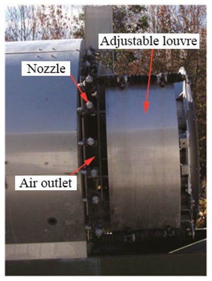 Khot et al. [] retrofitted an axial-fan air-blast sprayer with adjustable air-diverting louvres (Figure 8). Variable air supply was achieved by moving the air-diverting louvre plate to adjust the air outlet area. Figure 8 shows the air outlet’s fully open state. This retrofitted sprayer provided a new method for air adjustment, but it did not achieve real-time adjustment of the air supply based on crop characteristics. Furthermore, when the air outlet area was reduced, the air speed would increase while the air volume was reduced. Therefore, it failed to achieve independent control of air speed and air volume []. Li et al. [] developed a real-time variable-flow-rate variable-air-supply sprayer with 40 nozzles and eight fans. Each nozzle, coupled with a solenoid valve, independently achieved variable flow rate in real time by adjusting the duty cycle of PWM signals based on the canopy volume detected with the laser-scanning sensor. In addition, each brushless fan independently achieved variable air volume by changing its voltage to adjust its speed according to the canopy volume. This independent control of the eight-fan speed method increased air volume while maintaining a constant air speed. Jiang et al. [] designed a single-fan multi-duct bypass-air-regulation sprayer, which adjusted air volume and air velocity in real time by controlling the disc valve opening degree at the air outlet based on the crop volume detected with ultrasonic sensors. It was shown that this variable-air-volume sprayer immensely reduced drifts and ground losses of pesticides and improved canopy depositions. Miranda-Fuentes et al. [] developed an air blast sprayer with two axial fans mounted on a tower-like structure with four mobile air outlets. This sprayer could adjust the air outlet position based on the canopy shape detected with ultrasonic sensors to keep the distance between the air outlet and the canopy constant. It was found that because the movement mechanism was composed of pulleys and a rack-and-pinion system, the actuator speed was low, resulting in poor coordination with the sprayer’s forward speed.