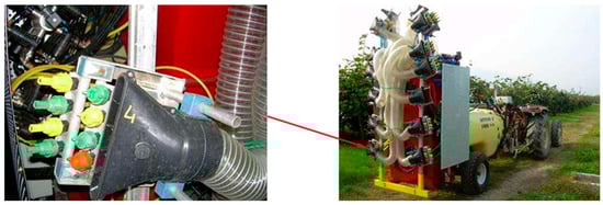 The distance between the nozzle and the target was one of the important technical parameters affecting spray performance. According to the target structural parameters or meteorological conditions, the real-time adjustment of the operating parameters of the sprayer, such as nozzle position and nozzle type, was one of the objectives of the intelligent variable sprayer. Osterman et al. [] developed a variable-nozzle-position air-assisted orchard sprayer, which could adjust three hydraulically movable spraying arms based on real-time detection parameters of the target structure from a laser scanner to better cover the target tree (Figure 9). This sprayer could immensely reduce pesticide drift and ground deposits, and improve application efficiency. Miranda-Fuentes et al. [] developed a new air-assisted sprayer that could adjust nozzle positions based on the olive characteristics to reduce spray drift and off-target application. Balsari et al. [] developed an intelligent sprayer which was able to automatically select the suitable nozzle type (conventional nozzle and air induction nozzle) to spray according to the natural wind conditions at the spraying time (Figure 10). A currently-developed variable-nozzle-position intelligent sprayer achieved nozzle up–down and left–right movement and nozzle angle adjustment relying on the mechanical structure driven by either the electric [] or hydraulic system []. The time required to complete these mechanical actions was relatively long, which did not match the travel speed of the sprayer. Consequently, it was difficult to achieve real-time adjustment of the nozzle position in spray application [].