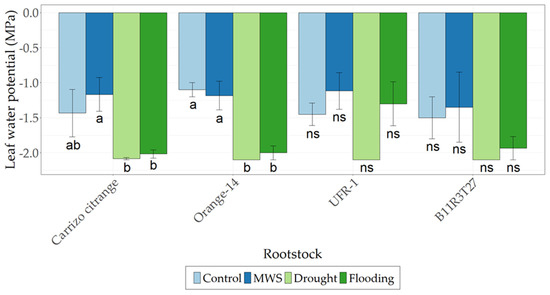 Mean leaf water potential (LWP; MPa) on four citrus rootstocks (Carrizo citrange, Orange-14, UFR-1, and B11R3T27) under four water conditions treatments (Control, MWS, Drought, and Flooding) at the end of the experiment. Values in columns with different letters denote statistical differences among the treatments per citrus rootstock by LSD-Fisher’s test (p < 0.05). MWS: Mild water stress; ns: not significant differences.