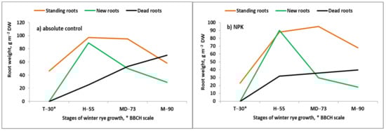 Effects of soil fertility on patterns of roots dynamics in winter rye during the growing season (based on Grzebisz [33]). Legend: T, stem elongation phase; H, heading; MD, milk development; M, maturity. * stages of winter rye growth according to the BBCH scale [34].