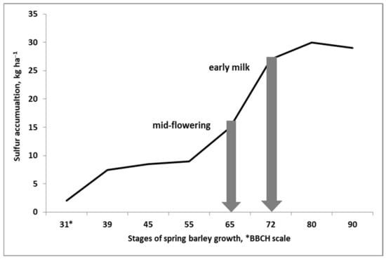 A plant’s demand for S is not constant throughout its life-cycle. As shown in Figure 6, the highest rate of S accumulation by spring barley occurs in the early stages of grain yield formation (full flowering to the early milk stage). In this particular period, the amount of S in spring barley almost doubled. This also applies to crops with a much higher requirement for S, such as winter oilseed rape, which is one the most sensitive plants with respect to S supply. This crop showed the highest demand for S from the middle to the end of flowering [90]. It can, therefore, be concluded that the presented pattern of S accumulation is typical for all seed plants. Four questions should be formulated at this point, which are important for the efficient management of S in the currently grown crop by the farmer: