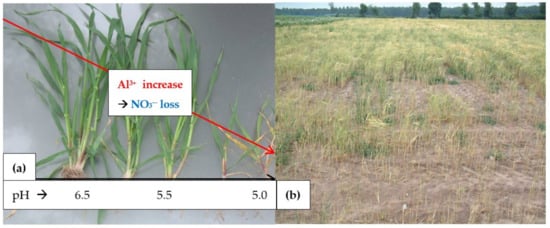 In general, Ca deficiency in classic field crops occurs only under extremely bad weather conditions, usually prolonged drought or in acidic soils. On sandy soils, which are naturally poor in total and available Ca, the low supply of Ca to the actually grown crop is often overlooked by farmers. The lower density of plants or a weak root system is, as a rule, considered to be caused by Al3+ toxicity (see Section 5), water shortages, and possibly low supply of N, K or other nutrients. The key set of factors contributing to Ca deficiency were presented in the previous chapter. A deficiency of Ca in the soil results in a less-developed root system, leading to decreased supply of nutrients to the plant [74]. Consequently, the plant growth rate decreases (Figure 4a). Moreover, during the growing season, some plants may fall out of the field. An exceptional situation (as shown in Figure 4b) is the drooping of inflorescences. The key reason for this is probably the low saturation of the plant vascular tissue with Ca.