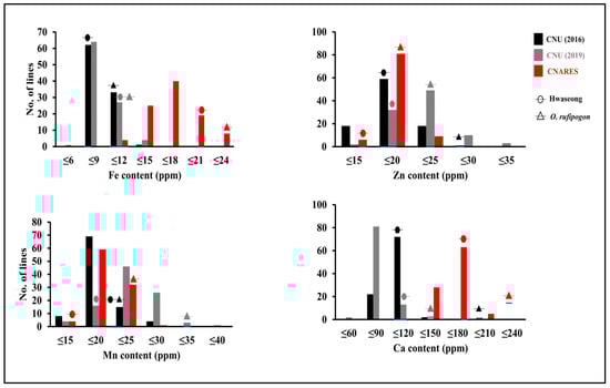 Correlation analysis of Fe, Zn, Mn, and Ca contents in the 96 ILs was performed (Table S5). Overall, a significant positive correlation was observed between Fe and Zn contents in ILs at both locations and years. A positive correlation between Fe and Zn contents has previously been reported, indicating that high Fe and Zn contents occur simultaneously in rice [34,35]. Across locations and years, a significant positive correlation was consistently detected between Mn and Ca contents. These results suggest that high Mn content might be accompanied by high Ca content in rice.