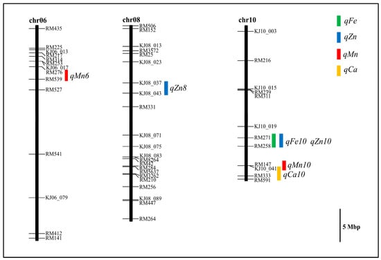 QTL analysis was performed to detect the genomic region controlling mineral element content in brown rice. QTL analysis using the genotype data from SSR and KASP markers and the mineral element content of each IL identified six QTLs on chromosomes 6, 8, and 10, consisting of one QTL for Fe, two QTLs for Zn, two QTLs for Mn, and one QTL for Ca (Table 2 and Figure 2). For Fe content, one QTL, qFe10, was found to explain 5.1% to 5.7% of the phenotypic variance. For Zn content, two QTLs, qZn8 and qZn10, were found to explain 9.3% to 27.0% of the phenotypic variance. For Mn content, two QTLs, qMn6 and qMn10, were found, explaining 4.8% to 39.2% of the phenotypic variance. For Ca content, one QTL, qCa10, was found, explaining 7.2% to 12.3% of the phenotypic variance. Neither qZn8, qMn6, qMn10, nor qCa10 was detected in the ILs from CNU in 2019. The qFe10 was not detected in ILs from CNARES. Comparative analysis of data across locations and years revealed that only qZn10 was consistently detected, indicating that this stable QTL may have a potential value in rice breeding programs. All favorable QTL alleles were derived from O. rufipogon. In this study, two cases of QTL co-localization were identified on chromosome 10. The grain Fe and Zn showed the co-localized QTL qFe10 and qZn10. The grain Mn and Ca showed the co-localized QTL qMn10 and qCa10 (Table 2).