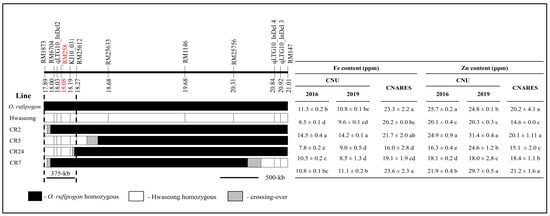 Graphical representation of four ILs and the map of the target region of qFe10 and qZn10. Physical position (Mbp) is shown under the chromosome. The mean values in each column with different letters are significantly different from each other at p = 0.05 based on Tukey’s test. Values represent mean ± standard deviation of triplicate (CNU) and duplicate (CNARES) measurements.