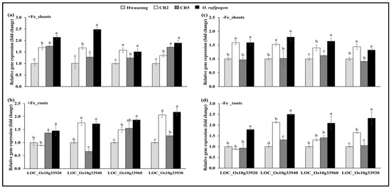 By comparing the results of whole genome sequencing data, spatiotemporal expression profile, and gene expression level, four genes, namely LOC_Os10g33920 (protein of unknown function DUF250 domain-containing protein), LOC_Os10g33930 (protein of unknown function DUF1336 domain-containing protein), LOC_Os10g33940 (auxin response factor 22 [OsARF22]), and LOC_Os10g33960 (rice homeobox gene 9 [OsHox9]) were selected for qRT-PCR in both roots and shoots of O. rufipogon, Hwaseong, CR2, and CR5 under all Fe and Zn treatments at greenhouse conditions (Figure 4 and Figure 5). Among the four selected genes, the transcription regulation gene LOC_Os10g33940, involved in hormone stimulus-response, consistently displayed higher expression in O. rufipogon and CR2 than in Hwaseong and CR5 in both roots and shoots (Figure 4a–d and Figure 5a–d). Additionally, O. rufipogon and CR2 consistently had higher expression of LOC_Os10g33960 in their shoots than Hwaseong and CR5, regardless of the Fe or Zn treatment (Figure 4a,c and Figure 5a,c). The O. rufipogon and CR2 consistently had higher expression of LOC_Os10g33930 in their roots than Hwaseong and CR5, regardless of the Fe or Zn treatment (Figure 4b,d and Figure 5b,d).