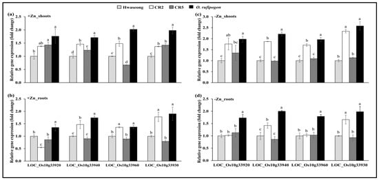 Quantitative real-time PCR analysis of the four candidate genes covering the qZn10 region. Relative expression levels of the four candidate genes in shoot tissues under (a) +Zn and (c) -Zn treatment conditions. Relative expression levels of the four candidate genes in root tissues under (b) +Zn and (d) -Zn treatment conditions. The mean values with different letters are significantly different from each other at p = 0.05 based on Tukey’s test. Error bars represent the ± standard deviation of the mean. All values represent the mean of three replicates.