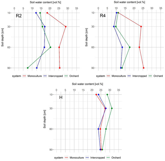 Soil volumetric water content in the monoculture and intercropped systems, and the walnut orchard during: S—maize sowing date; V5—five leaves stage; R2—blister stage; R4—dough stage; H—harvest. Data show average values for the 10-day recording period.