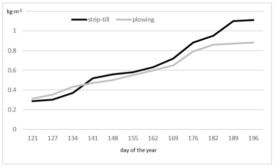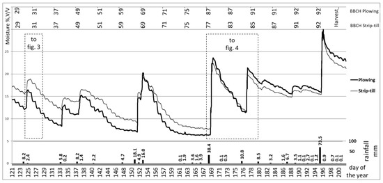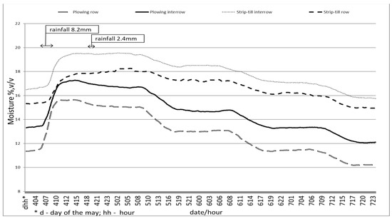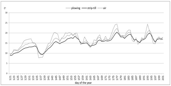 Figure 3). From 30 April (120th day of the year) until 30 May (150th day of the year)—151–153th day of the year there were of rainfall with a total of 39 mm—soil moisture in ST was higher than in plowing in the range from 1.0 to 4.2%,