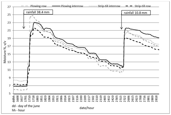 35] observed that after heavy rain in a row of plants in ST, the moisture increased faster and decreased faster than in the inter-row. Such reactions were not observed in the studies presented in this manuscript.