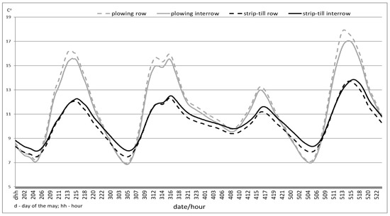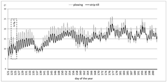 37] who compared PT vs. NT and showed a difference of 1.97 °C and even 3 °C when the soil surface was covered with plant residues. The slightly greater differences reported by the cited authors may be due to the fact that in the study of this manuscript, the area of ST cultivated strips constituted 1/3 of the total area and was devoid of plant residues.