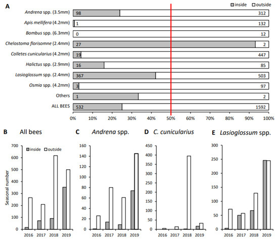 Bees (Hymenoptera: Apidae) collected in coloured pan traps placed inside and outside the netted plot of apple trees during the flowering period in the years 2016–2019. (A) Relative abundance of different genera or species. The red line indicates equal numbers inside and outside. Absolute numbers are displayed in the bars. The average thorax width (mm) is given next to species names. The lower panels represent yearly numbers of (B) all bees, (C) Andrena spp., (D) Colletes cunicularius, and (E) Lasioglossum spp.