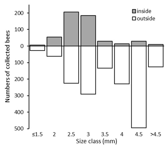 The histogram of bees inside and outside the netted plot based on actually measured thorax width of each individual bee (Figure 3) also shows that bees larger than 3 mm width were collected in highly reduced numbers inside (81 individuals) compared to outside (984 individuals). Smaller bees (≤3 mm) were collected frequently inside (450) and outside (608) the netted plot.