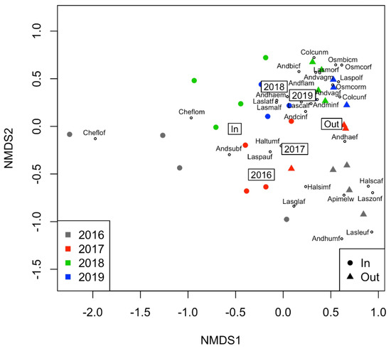 Ordination plot with non-metric multidimensional scaling (NMDS) of bees collected in coloured pan traps placed inside (circles) and outside (triangles) the netted plot of apple trees during the flowering period in the years 2016–2019 (different colours). Each data point represents the seasonal sum of one trapping station. Species with less than 5 collected individuals over all years and traps were not considered. For abbreviations of species names see Supplementary Materials, Table S3. The centroids of each year and the plot type (in/out) are indicated in boxes.