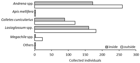 Large bees (average thorax width > 4 mm), including A. mellifera, Bombus spp., C. cunicularius, and Osmia spp., were almost absent inside the netted plot (Figure 2A,D). Middle sized Andrena spp. (width 3.5 mm) and Halictus spp. (width 2.9 mm) were found more frequently inside the plot, but numbers were generally lower than outside (Figure 2A,C). Small bees (width 2.4 mm) were abundant inside, with Lasioglossum spp. showing almost equal numbers inside and outside (Figure 2E) and C. florisomne being collected almost exclusively inside (Figure 2A).