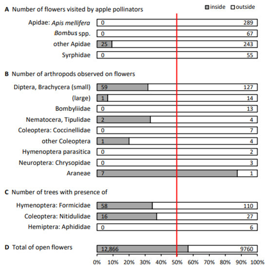 Flower visitation observations inside and outside the netted plot of apple trees during the flowering period in the years 2016–2019. (A) relative numbers of observed apple flowers visited by apple pollinators, (B) numbers of other arthropods observed in or on flowers, (C) numbers of trees infested with ants (Formicidae), pollen beetles (Nitidulidae), or aphids (Aphididae), and (D) estimated total numbers of open flowers on the observed trees. The red line indicates equal numbers inside and outside. Absolute numbers are displayed in the bars.