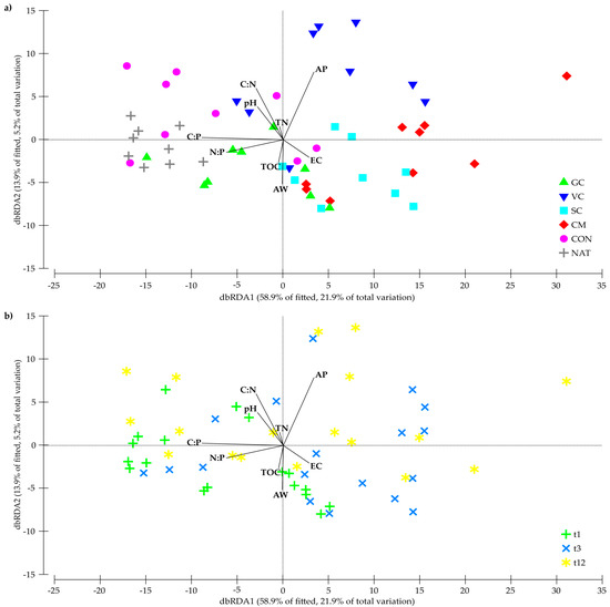Distance-based redundancy analysis (dbRDA) of soil bacterial community and physico-chemical properties for restored, control, and natural reference soils (a), and for soil sampling campaign (b). EC: electrical conductivity; AW: available plant water; TOC: total organic carbon; TN: total nitrogen; AP: assimilable phosphorus; C:N: carbon-to-nitrogen ratio; C:P: carbon-to-phosphorus ratio; N:P: nitrogen-to-phosphorus ratio. GC: greenhouse crop residues compost; VC: vermicompost; SC: organic compost derived from the mixture of chicken and sheep manure; CM: manure from chickens raised on the soil of organic farms; CON: unamended control soils; NAT: natural reference soil. t1: initial soil sampling; t3: soil sampling at 3 months; t12: soil sampling at 12 months.